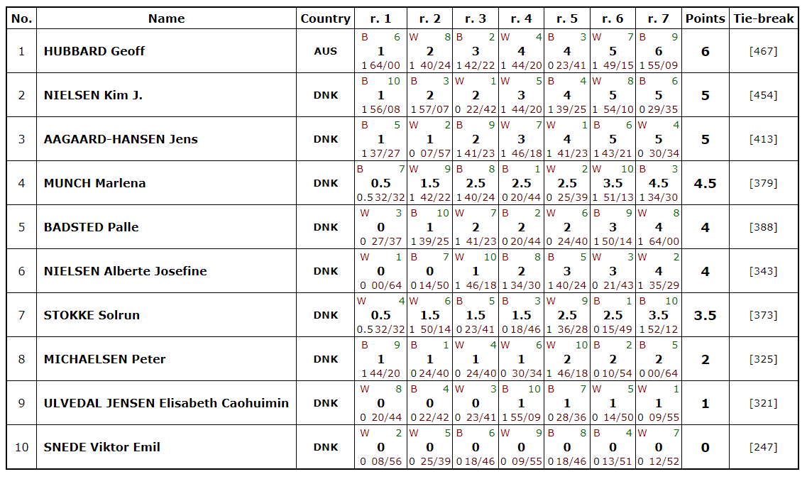 Turneringen samlede hele 10 spillere fra hele landet. Det var dog klart allerede efter de første runder, at de lokale spillere nok skulle tage sig pænt af gæsterne. Det lykkedes alligvel Jens at stikke næsen lidt frem, da han som den eneste slog Geoff. Men den største overraskelse var nok Alberte, der endte med at slå både Palle og Kim.